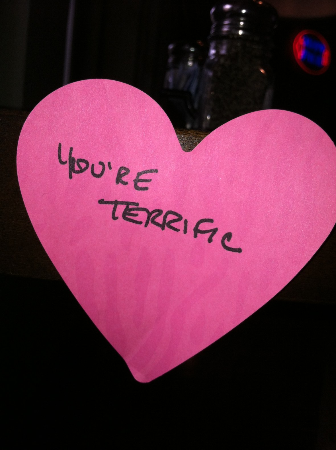I did! I have post-it’ed messages in lots of fun places today…This one was put on the napkin holder at Uno’s…